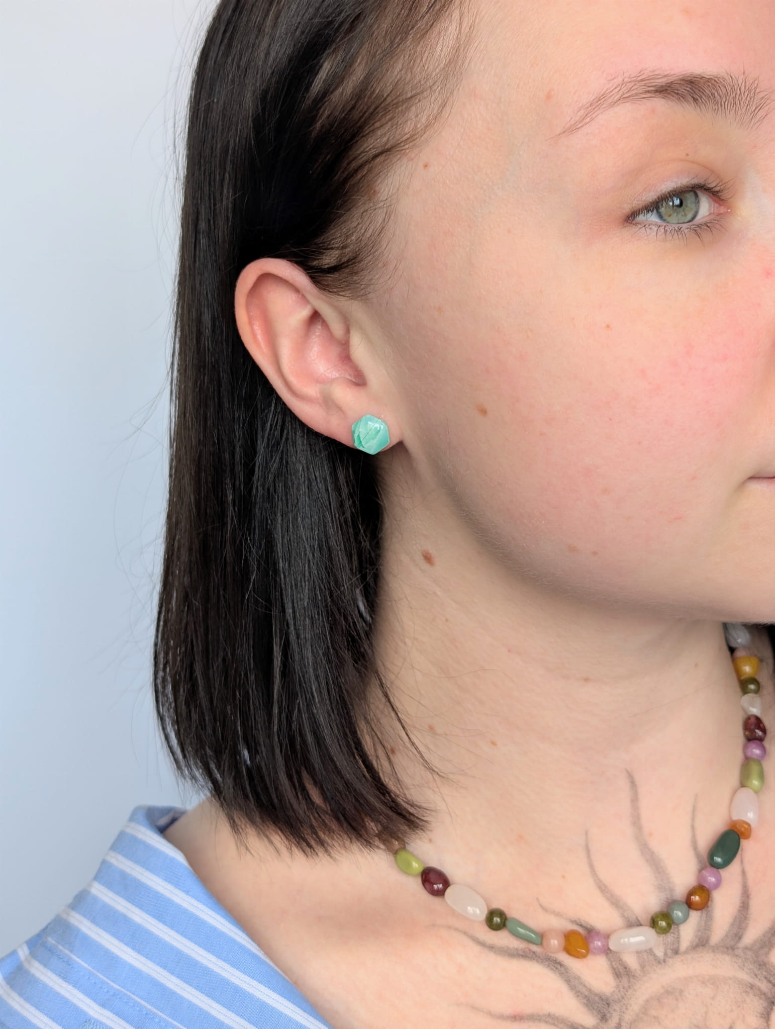 Zestaw kolczyków sztyftów – limonkowe kwadraciki i miętowe heksagony, marmurkowe