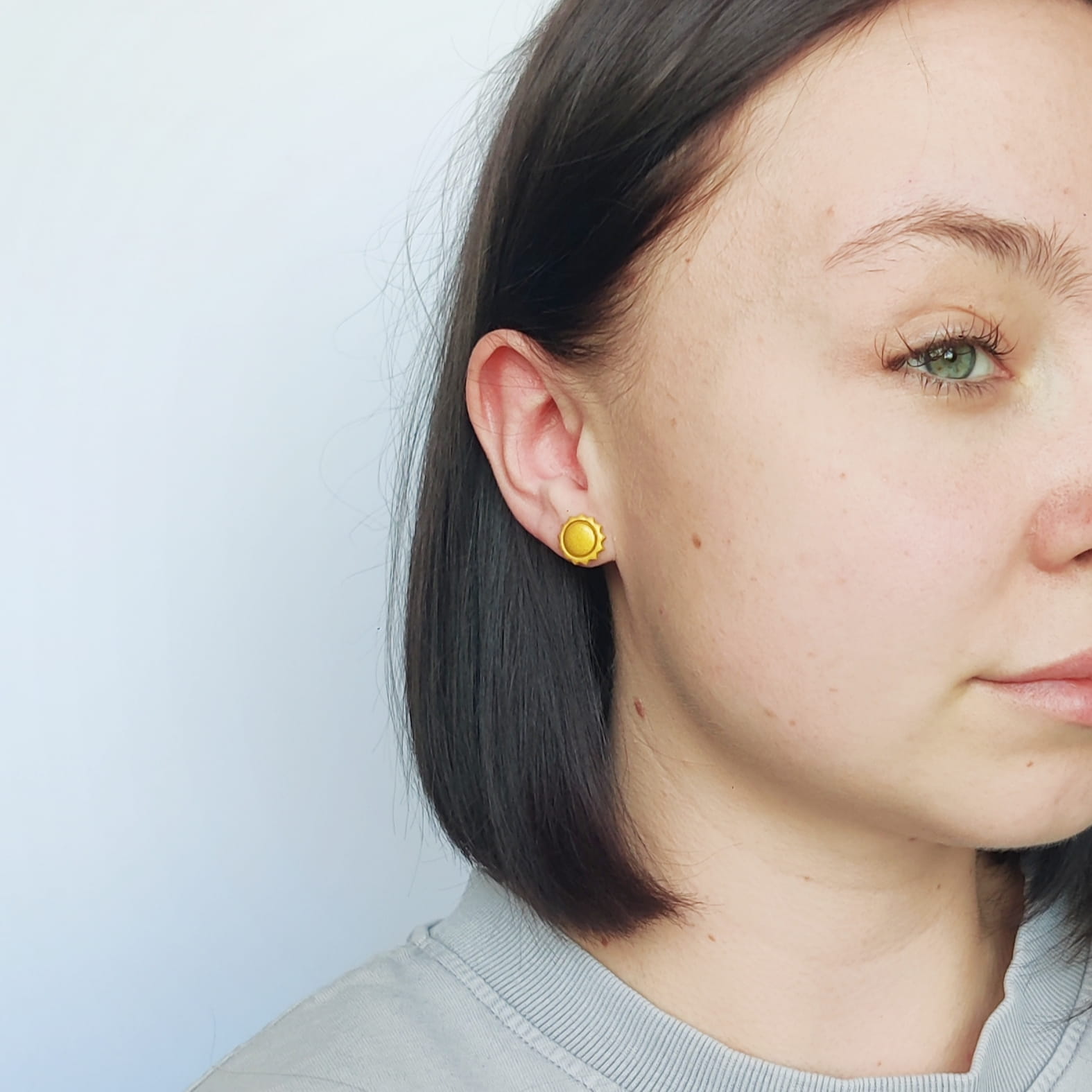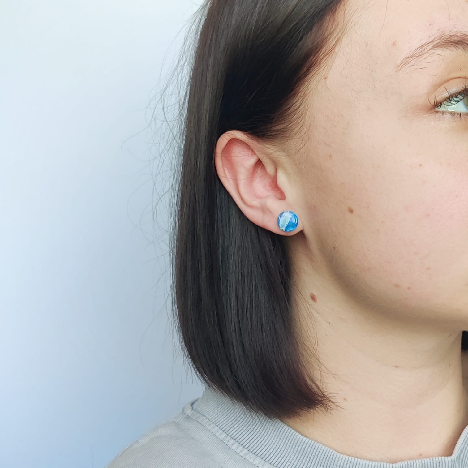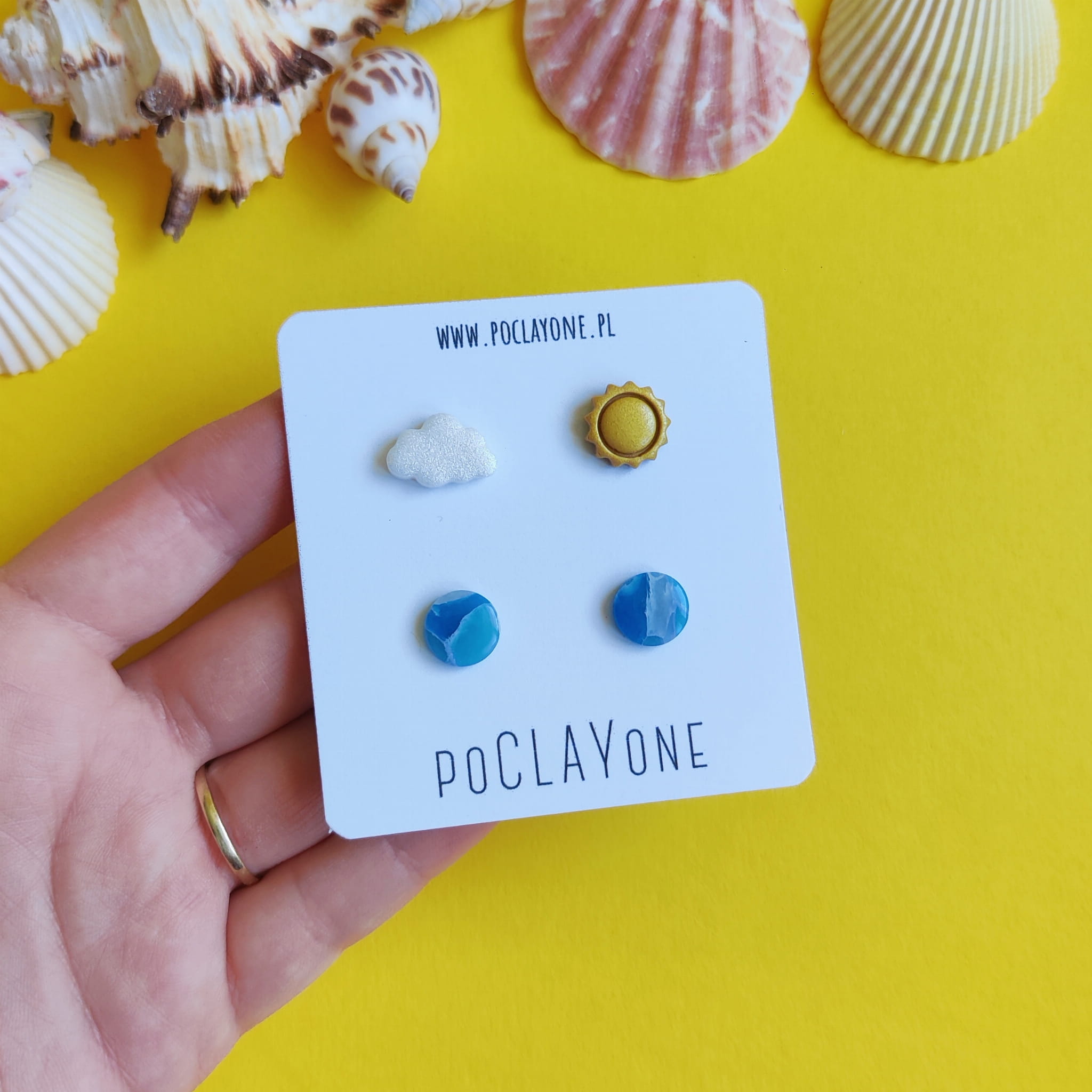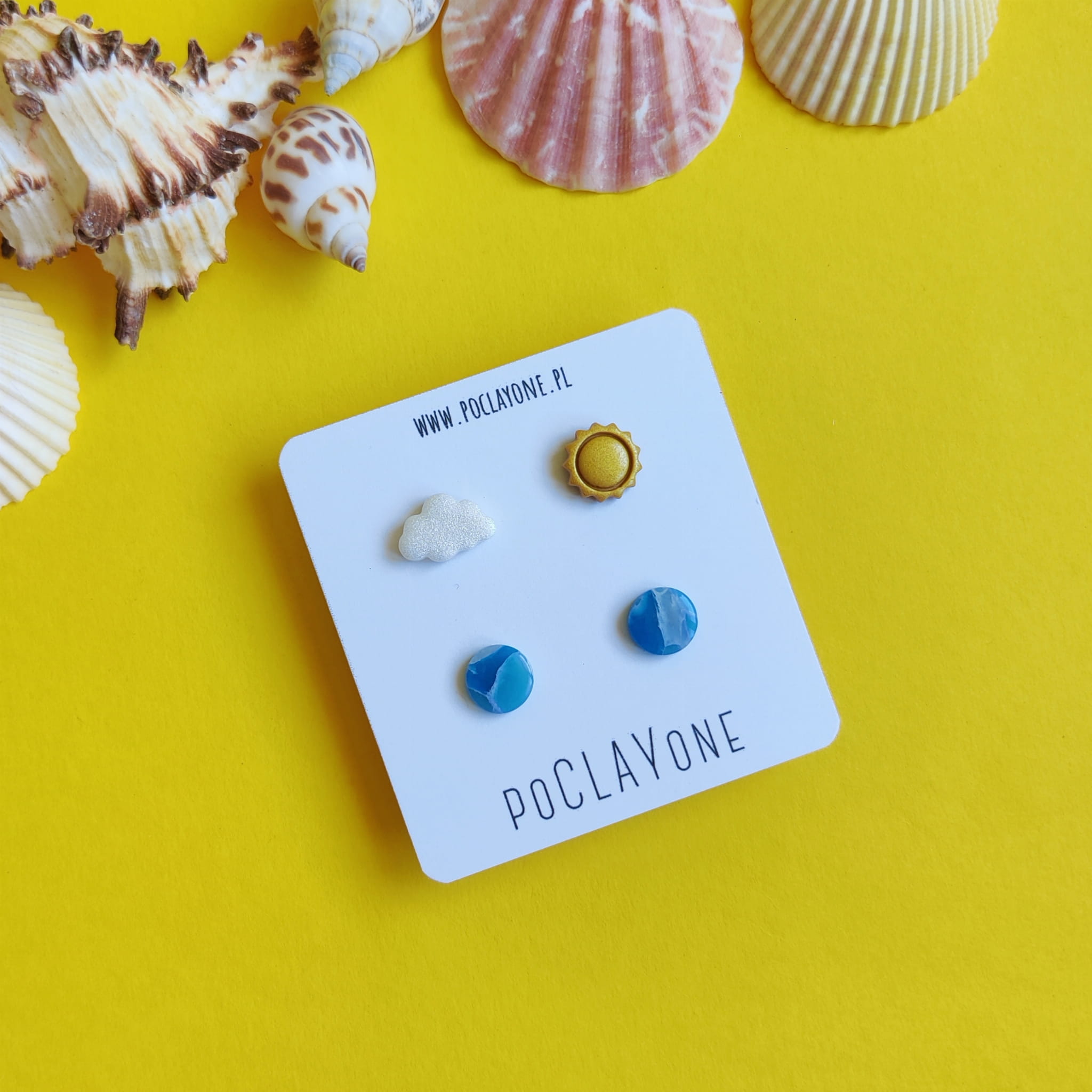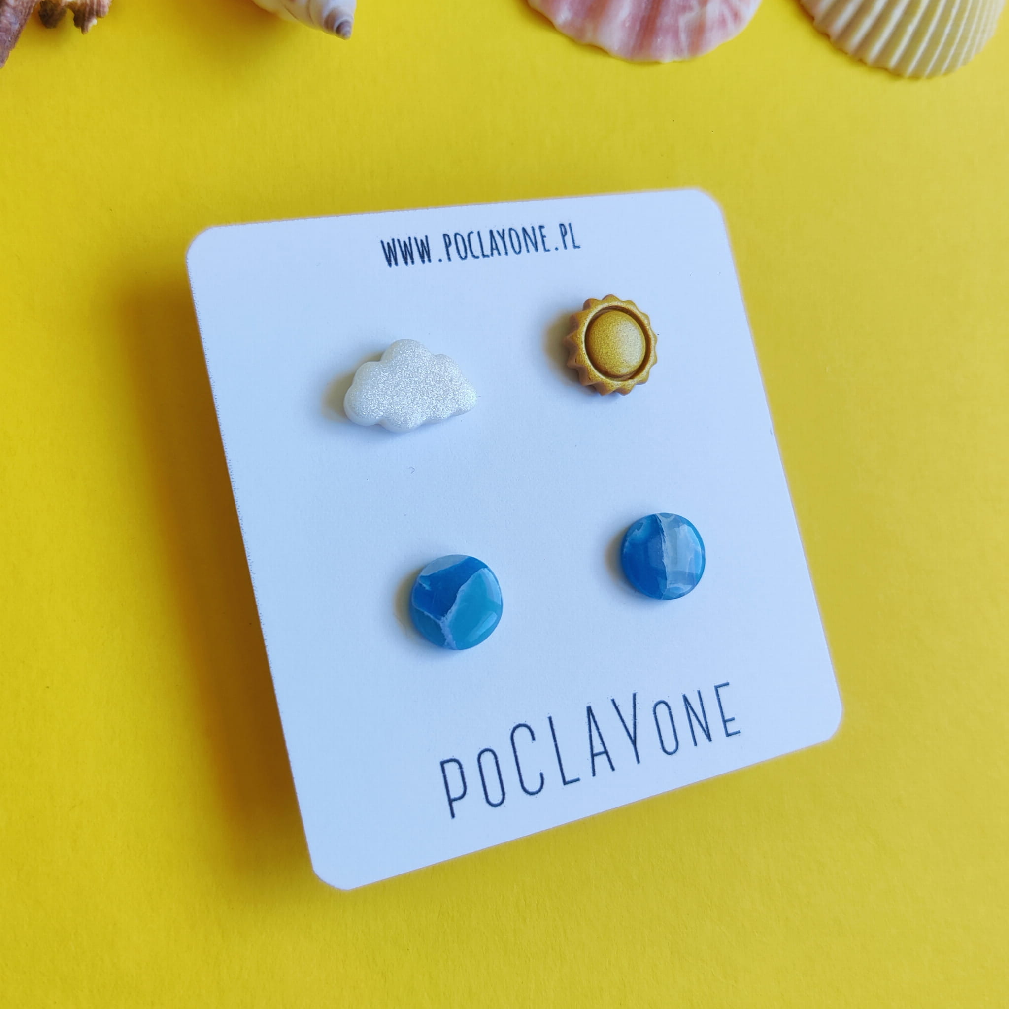 Unikalny zestaw kolczyków sztyftów „para nie do pary” z morskimi marmurkami, perłowym obłoczkiem i złotym słońcem. Idealny na letnie dni i wakacyjne stylizacje.