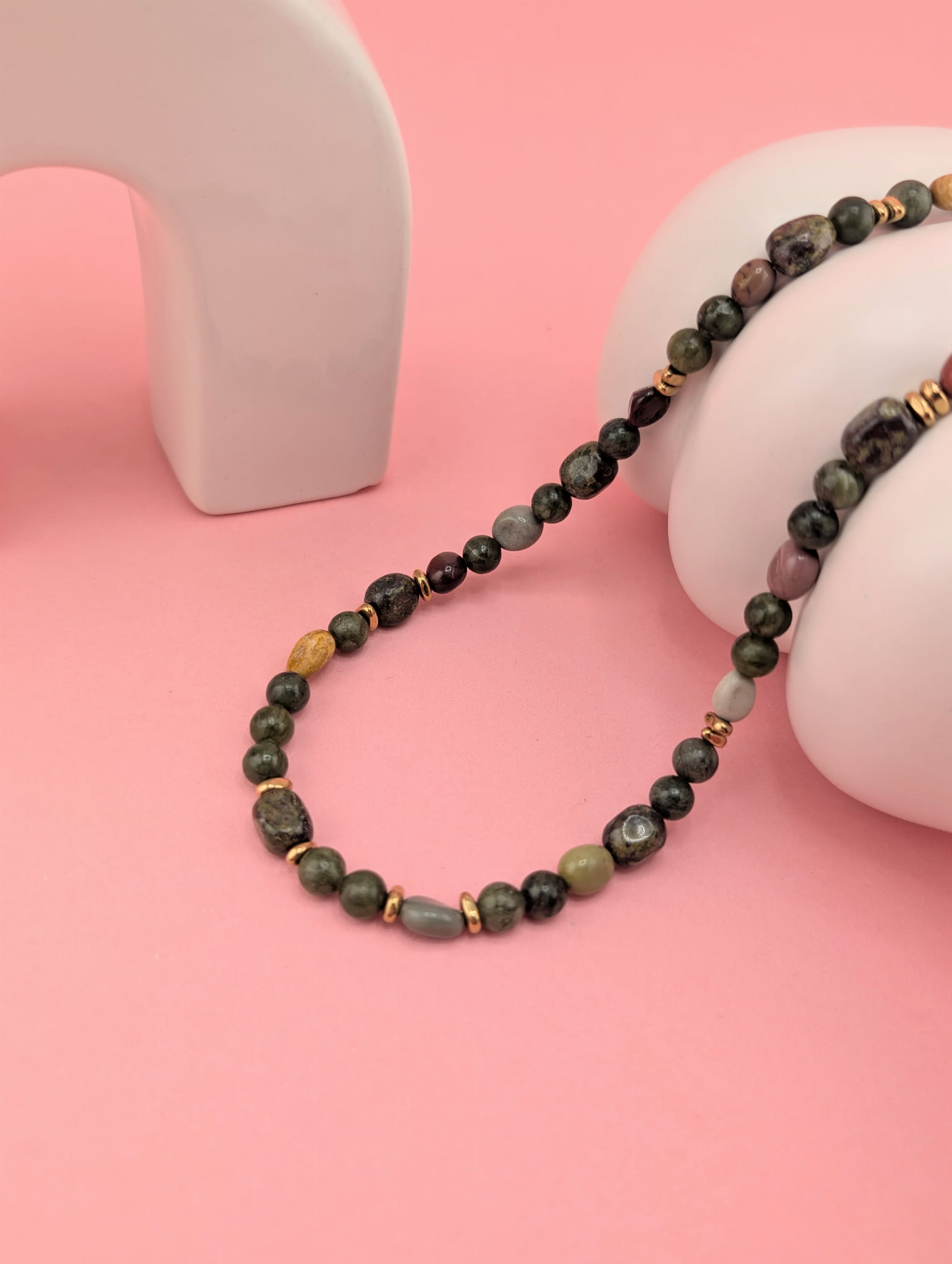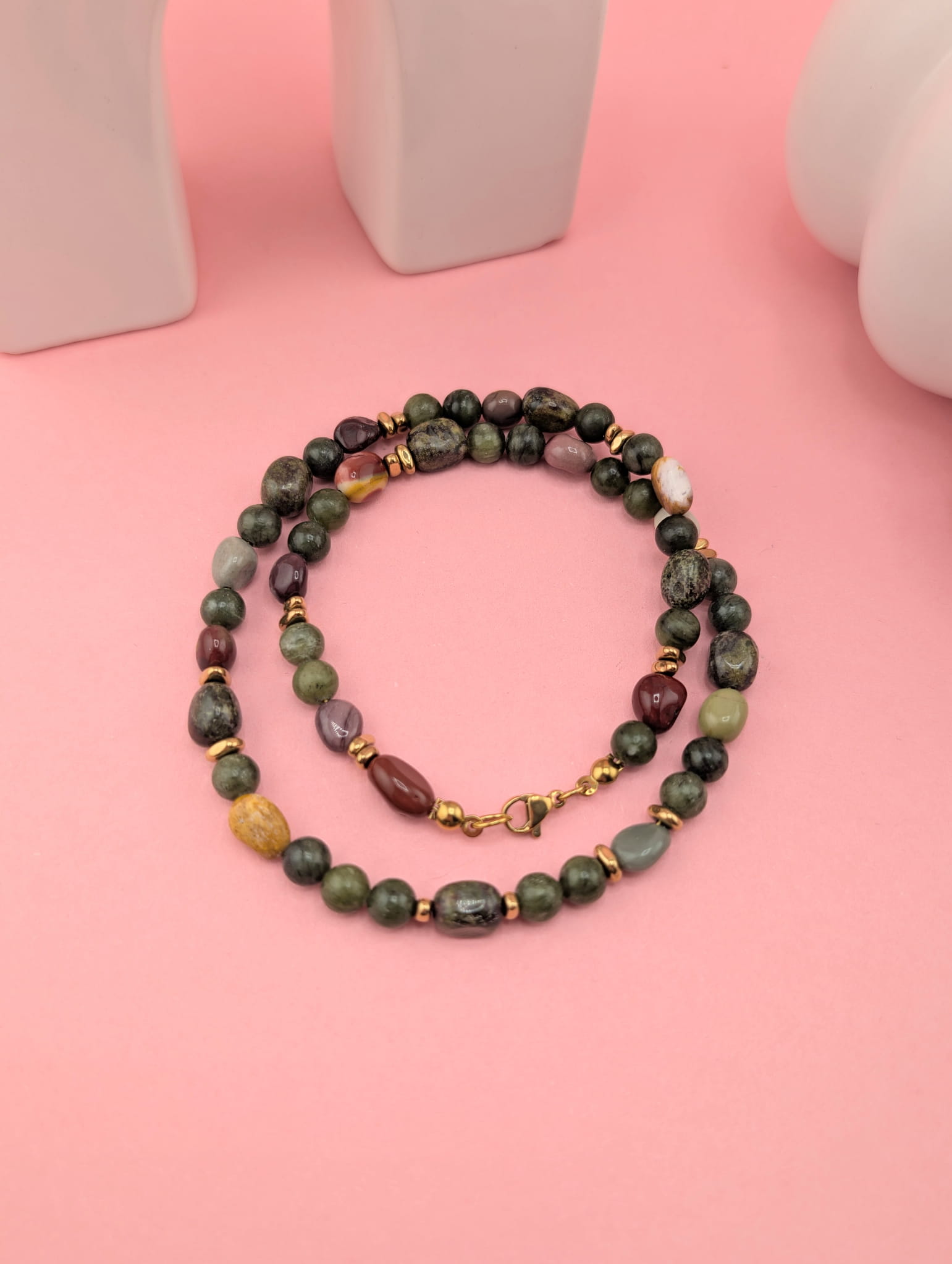 Naszyjnik wykonano z serpentynitu, jaspisu „smocza krew” i agatu, co sprawia, że każdy egzemplarz jest unikatowy. Kamienie naturalne pięknie współgrają ze sobą, tworząc elegancką i harmonijną całość.