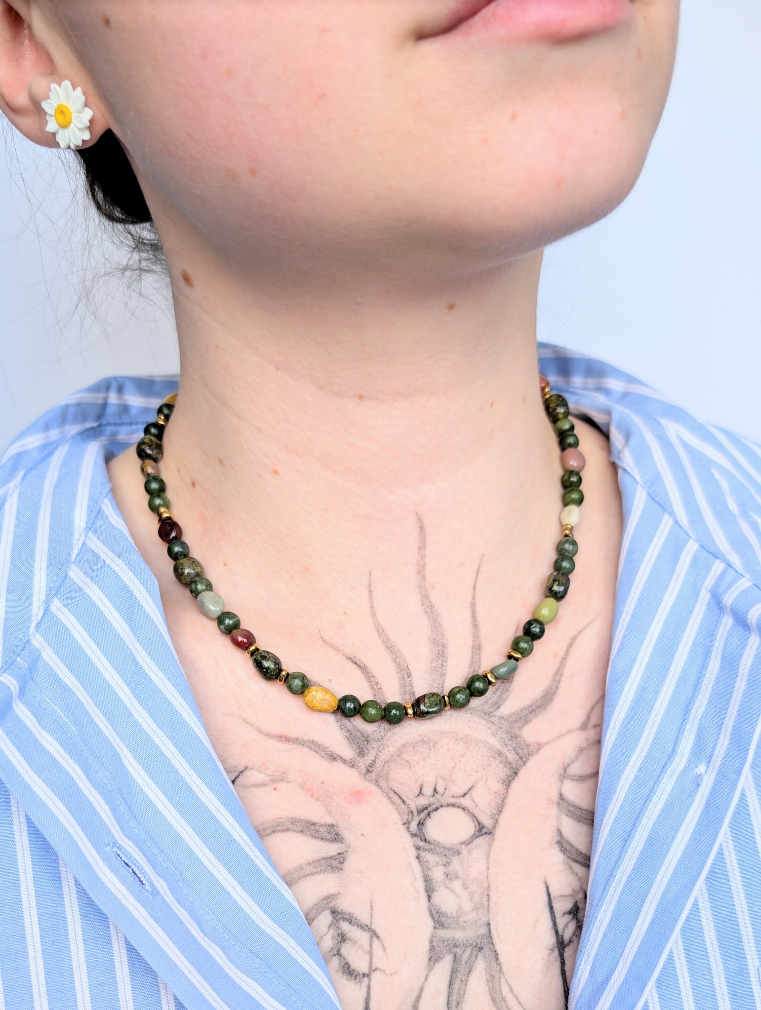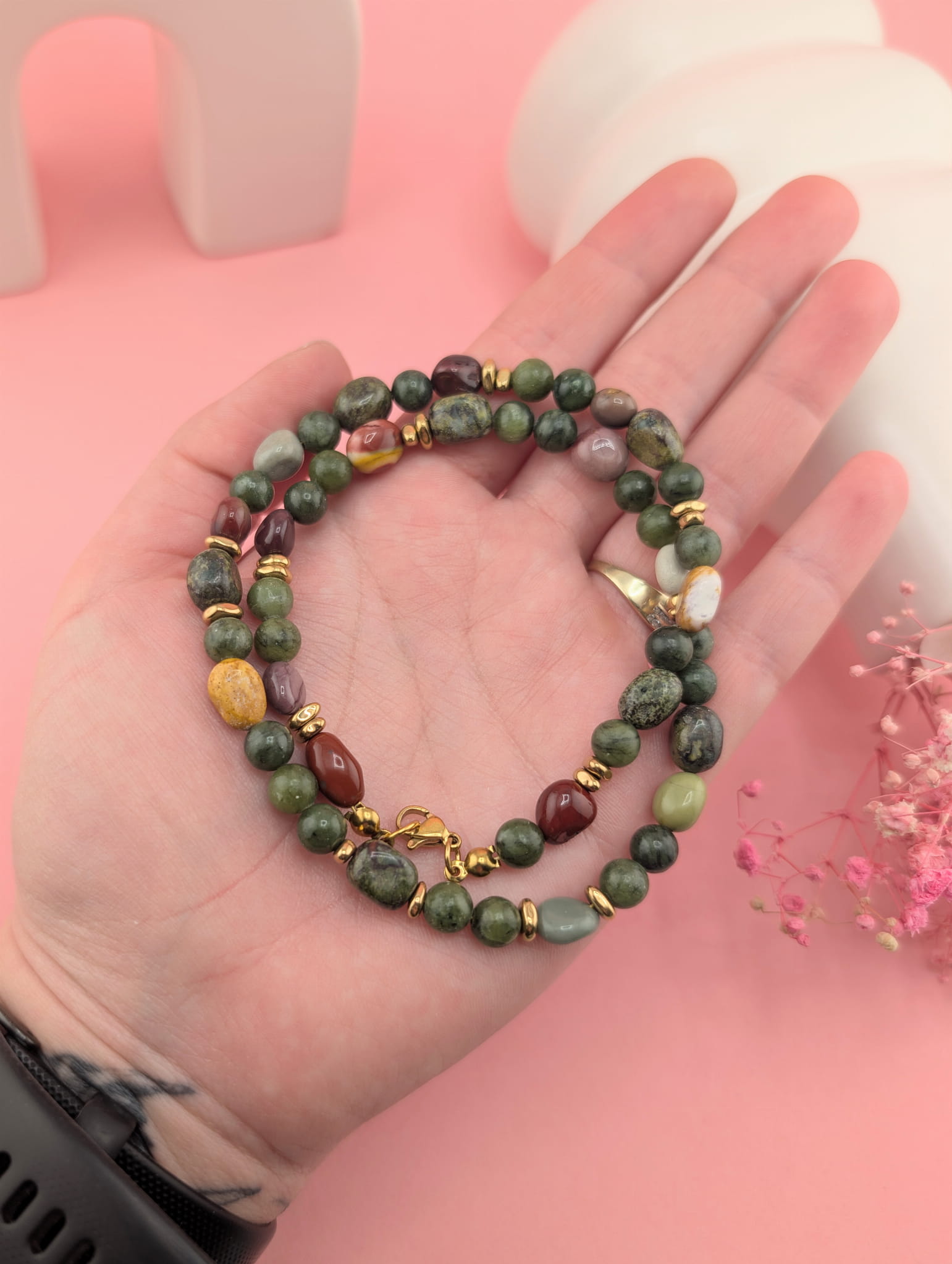 Naszyjnik w odcieniach zieleni łączy intensywny kolor serpentynitu z ciepłymi, czerwono-brązowymi akcentami jaspisu „smocza krew” oraz subtelnym agatem. To połączenie nadaje biżuterii wyjątkowego, naturalnego charakteru.